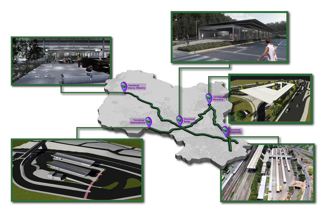Os Terminais de Integração são instalações que permitem a integração e transferência entre os serviços troncais com múltiplos alimentadores. A nova rede de transporte será composta por 5 Terminais de Integração: Darcy Ribeiro, Sede, Petrolândia, Ressaca e Eldorado. Desses, 4 serão implantados e 1 terminal já existe, que é o terminal Eldorado, que será reformado.